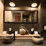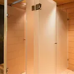 Bathrooms include a shower and a toilet, along with toiletries and towels.
